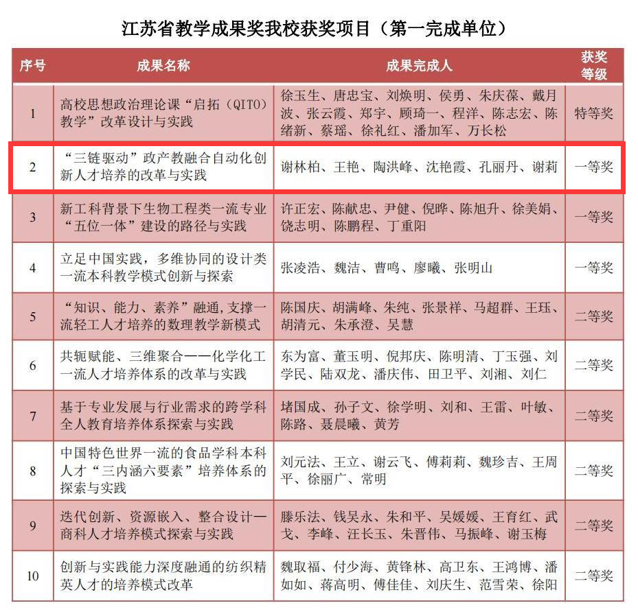 近日,江苏省教育厅正式发布了《关于公布2021年江苏省教学成果奖获奖项目的通知》(苏教人〔2022〕4号),av片 作为第一完成单位喜获10项江苏省教学成果奖。其中,由我院谢林柏教授主持完成的《“三链驱动”政产教融合自动化创新人才培养的改革与实践》荣获高等教育类一等奖。
