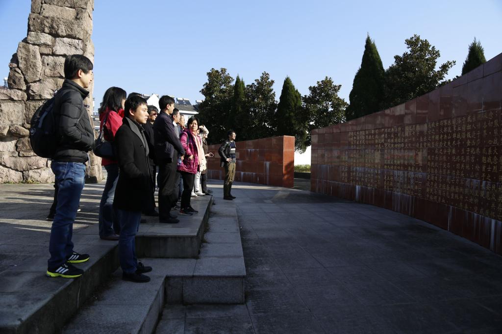 最后,全体党员前往茂林皖南事变激战地。“41.1.7”广场是皖南事变主战场的标记物,“41.1.7”这四个用巨大的大理石堆砌而成的数字,巍然矗立在广场中央,记载了皖南事变发生的时间。它身后由左向右逐渐增高的红色背墙,象征着一面红旗,墙体详细记载了事件的经过。