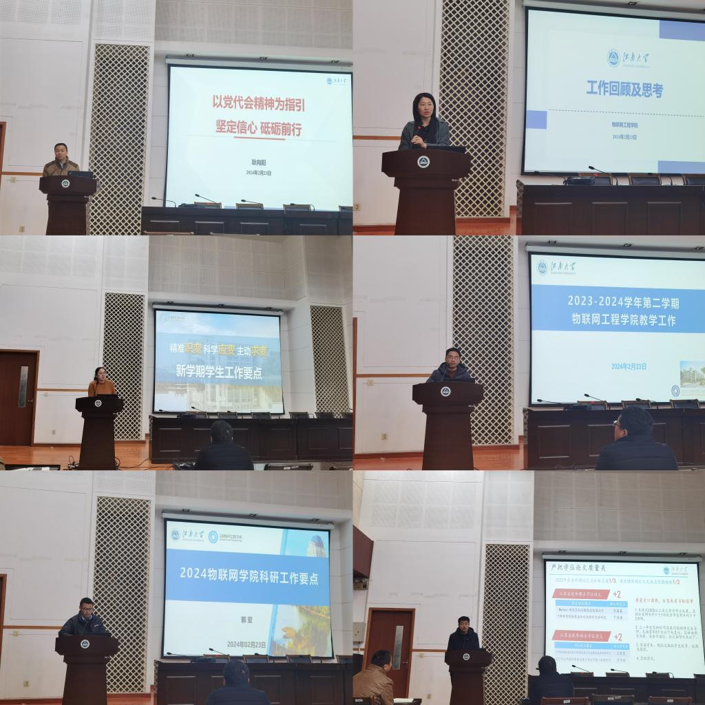 耿向阳首先代表班子成员向全体教职工致以新春的问候,感谢各位老师上一年度的辛勤付出。随后,班子成员就分管领域年度重点工作一一进行部署。耿向阳从“强化党的建设,引领学院高质量发展”和“拓展社会资源,为学院发展保驾护航”两个方面展开,号召全体教职工坚定信心,砥砺前行。栾小丽首先介绍了学院2023年度绩效考核情况和专任教师考核方案修订思考,回顾了上一年度学院在人才培养、科学研究、社会服务等方面的工作成效,重点就电子信息专业博士点申报、高层次人才引培、有组织科研、本科及研究生教育教学改革等年度重点工作进行部署。孔丽丹围绕“精准识变、科学应变、主动求变”三个关键词介绍年度学生工作思路和举措,将学工条线工作与学院改革发展中心工作深度融合、一体谋划。陶洪峰从做好本科人才培养方案修订提升人才培养质量入手,力求在重点教材、一流课程、示范中心建设等方面取得突破。郭亚从国基申报、奖项申报、横向合作及成果转化、国际交流合作四个方面讲解科研工作重点。梁峻阁就本学期研究生教育管理时间节点作工作提醒,新学期将重点做好质量工程建设,以期实现研究生专项省部级教改项目、教学成果奖的突破。