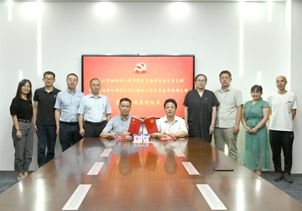 信息技术系党支部与中国电信股份有限公司无锡分公司市场部党支部,在中国电信无锡分公司国脉大楼会议室,举行了“党建翼联”结对共建签约仪式。中国电信股份有限公司无锡分公司党委委员、副总经理陈青,av片