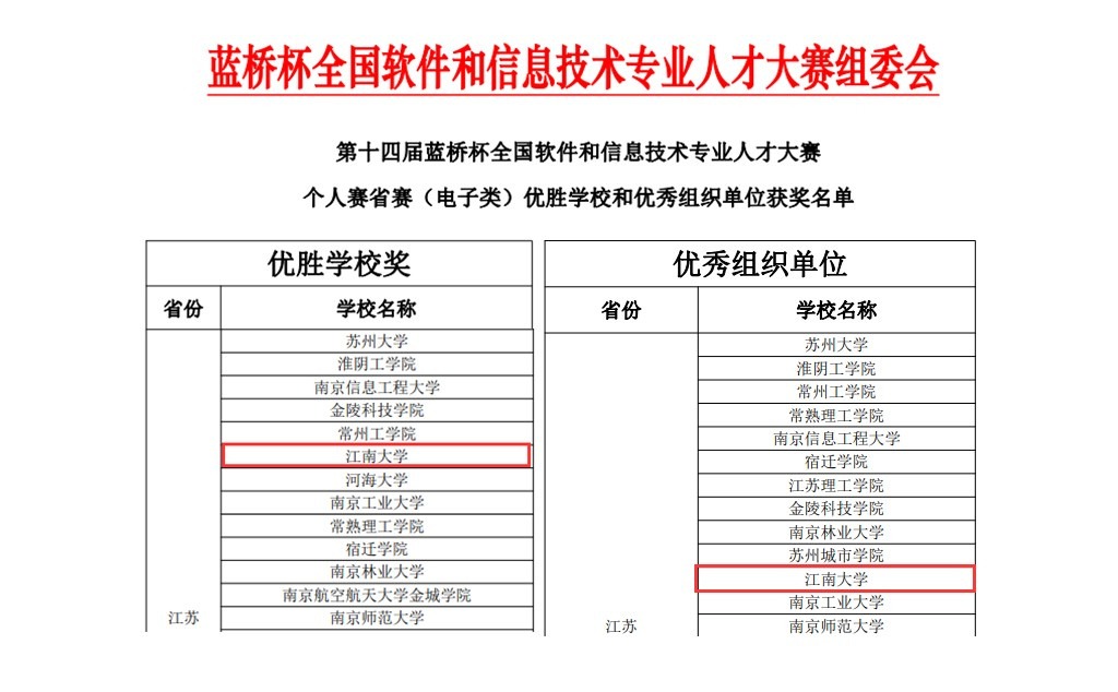 近日,第十四届“蓝桥杯”全国软件和信息技术专业人才大赛江苏省赛电子类赛道落下帷幕。江南学子共获电子类奖项69项,其中一等奖16项、二等奖27项、三等奖26项,16人取得国赛参赛资格,av片