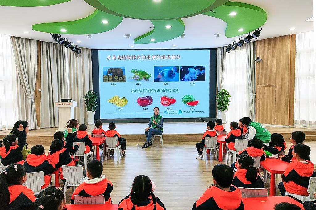 “同学们,水资源一直以来都是我国乃至世界紧缺的资源之一,在生活中我们应该节约用水,保护水资源……”。科普讲座环节,汇思公益团的志愿者李琨莹从水的特性、水与生命、水与生活、节水技巧四个方面,为小朋友们科普水知识,引导小朋友们了解水的重要性,掌握一些节水小妙招,增强“节约用水,从我做起”的环保意识。“同学们,我们可以为节约用水做些什么呢?”,李琨莹以问题为出发点,充分调动小朋友们的积极性,引发同学们对生活实践中节约用水的思考。“洗完手后,及时关水龙头”“洗菜的水可以用来浇花”,小朋友们积极踊跃回答问题,争相分享自己的节水小妙招,课堂氛围十分活跃。