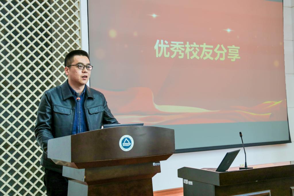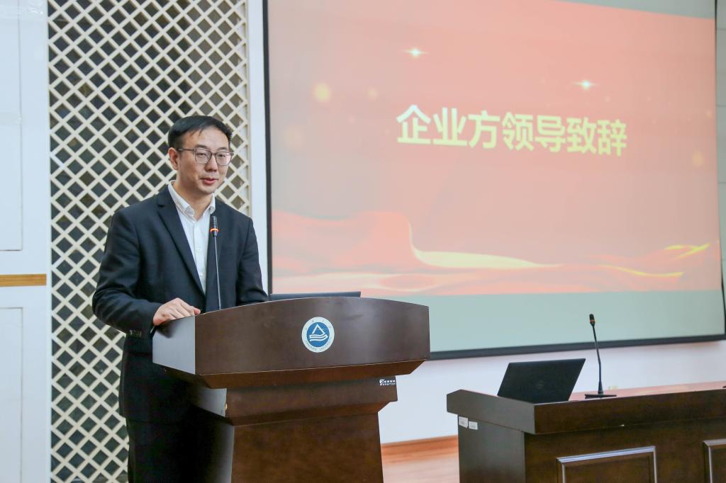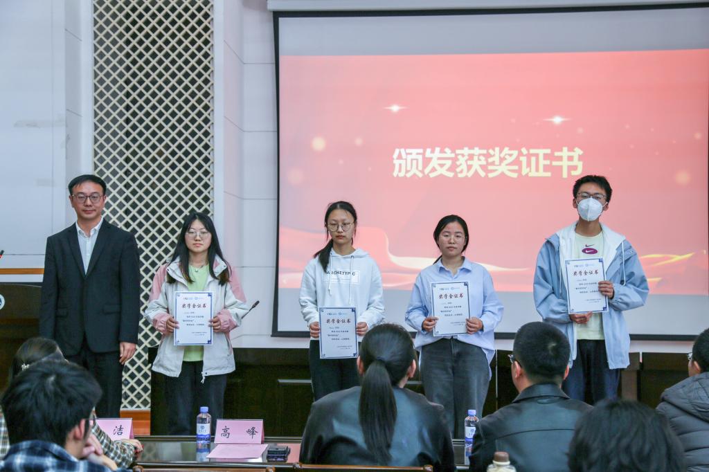 高峰先生为获奖的4名同学颁奖,并代表企业发言。他对学院在培养复合型人才方面所做的工作表示肯定,对获奖同学表示称赞与认可。通过介绍公司的发展历程以及在产教融合、校企合作等方面所取得的成果,鼓励在场同学理性追逐梦想,紧跟时代发展步伐,在青春的赛道上跑出属于自己的最好成绩。