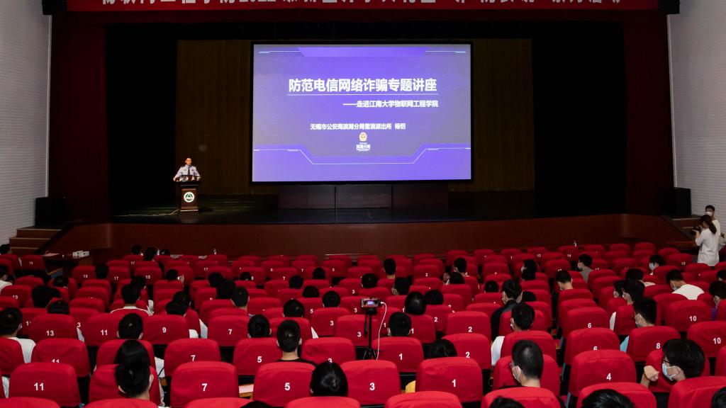 在文浩馆观众厅举办新生防诈骗安全教育专题讲座。无锡市公安局滨湖分局雪浪派出所杨恺警官受邀担任主讲嘉宾,全体研究生和本科新生参加活动。