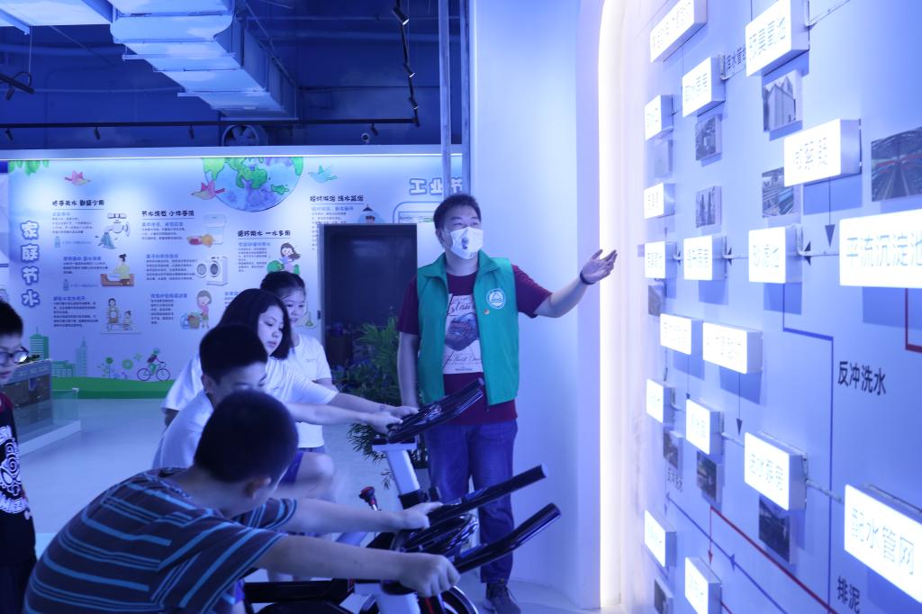 团队成员带领孩子们参观了融教学、娱乐于一体的节水基地,向孩子们讲解习近平生态文明思想、水资源知识,展馆展示了中国水利工程、水资源现状、水的危机、制水工艺、家庭节水、海绵城市等资料。孩子们体验了自行车发电、VR等项目,亲眼见证了人与水资源的关系演变的曲折过程。在观察水质监管系统的实时数据分析过程中,孩子们体会到生物-生态治理技术的妙处,强化了“绿水青山就是金山银山”的生态观,坚定了节水护水、努力学习的信心决心。