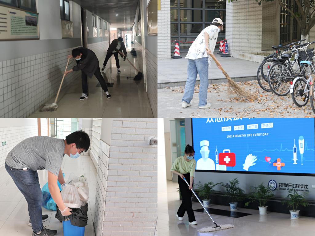 公共区域卫生环境的现状。面对这一情况,学生们自发组建起“物联红”志愿服务队,主动扛起了扫帚、墩布,提着水桶,拎上消毒雾化器,化身校园“保洁员”,在劳动中感悟担当、体验快乐,开启了一堂真实而生动的“劳动育人”实践课。