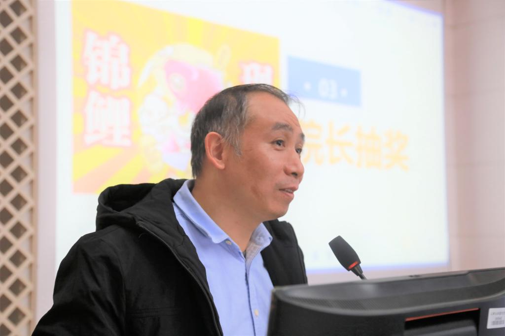 谢林柏开启“锦鲤抽奖”环节,为同学们送上祝福。入场前,每位同学都领取了写着号码的“幸运签”,谢院长现场随机抽取号码,并为中奖的同学颁发“盲盒礼”,希望同学们好运常伴左右,在考场上乘风破浪、所向披靡。