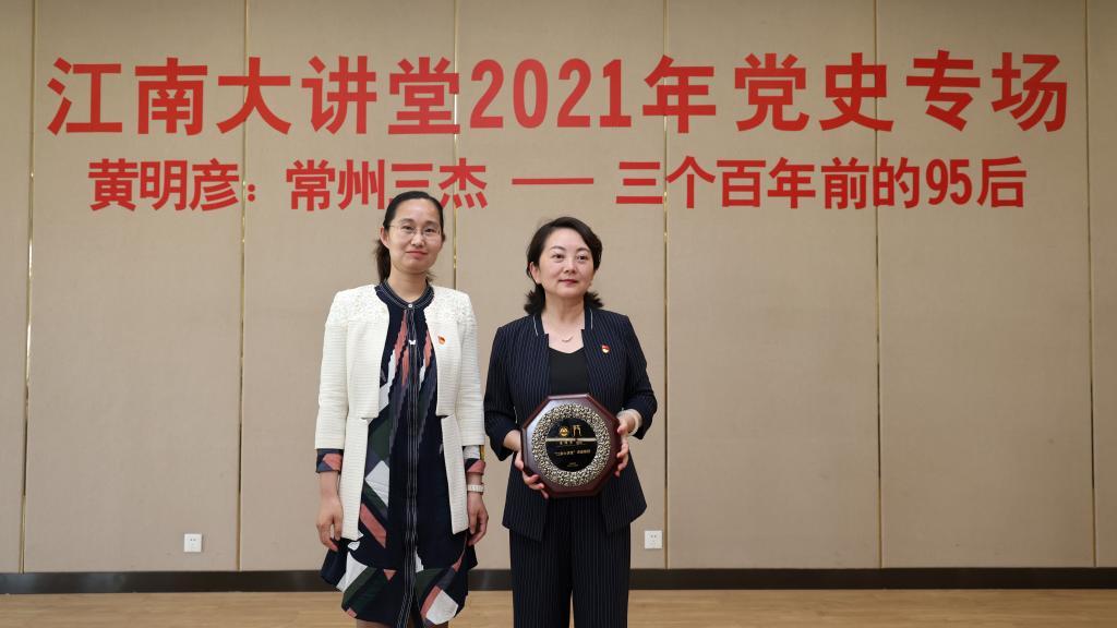 陆敏芝为黄明彦颁发“江南大讲堂讲座教授”纪念牌。随后,黄明彦开讲《常州三杰——三个百年前的95后》主题报告。她以瞿秋白、张太雷、恽代英的成长历程为时间轴,将三位先烈的革命事迹向大家娓娓道来。她指出,先烈们一腔热血的爱国精神,百折不挠的奋斗精神,勇立潮头的担当精神和心系人民的家国情怀,体现了一代又一代革命者们对民族最深沉的责任感和对国家最执着的爱,这些精神值得我们永远缅怀和怀念。最后,参会人员合唱《国际歌》,以此来纪念国际歌的第一位中文翻译者瞿秋白。至此,“百年前的95后——常州三杰精神走进av片