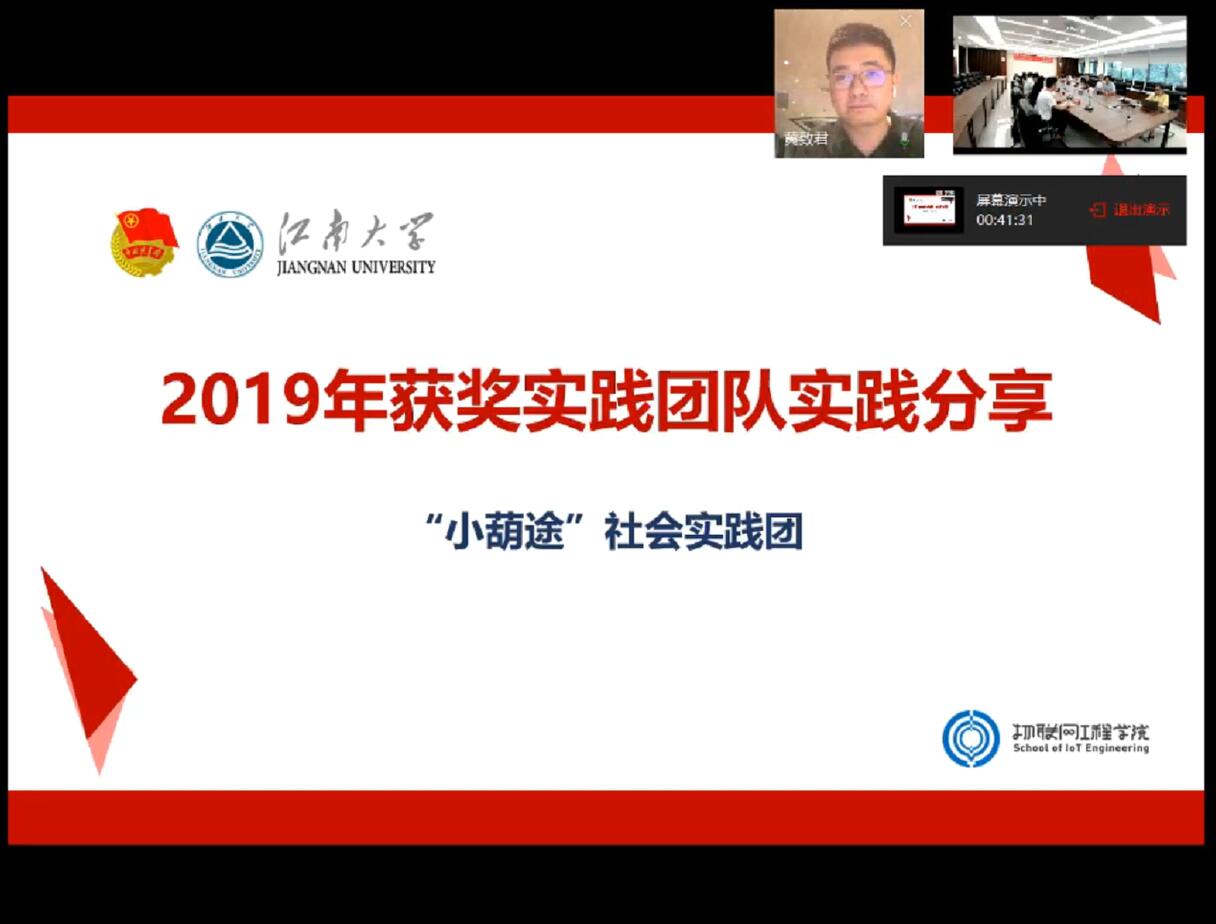 2019年省级优秀社会实践团队——“小葫途”实践团负责人黄致君通过直播连线作了分享发言。结合“小葫途”团队的实践经历,通过精心制作的PPT,他从社会实践前期筹备、资源联系、新闻宣传、活动总结等七个方面进行了经验分享,给与会同学诸多启发。
