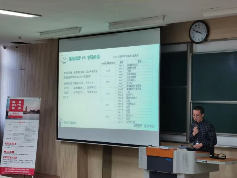丁洋首先以自己为例,将基础英语的重要性生动形象地解释出来,然后列举了两个学生的实例,有力地说明了学雅思给他们带来的巨大优势,并引用易经当中“取法乎上得其中,取法乎中得其下”的经典语句,鼓励同学们对自身英语水平提出更高要求。除此之外,丁洋还将雅思英语与四六级和考研英语进行了对比,进一步阐释了学习雅思的优势所在。接着,丁洋总结了学习英语的“五座大山”,即语音、词汇、语法、交流、以及地方口音问题,并向我们推荐了发音纯正的影视剧、广播以及阅读材料。最后,丁洋分享给了我们学习英语口语的三个方法,引用实例,让同学们在互动中感受到了英语的魅力。