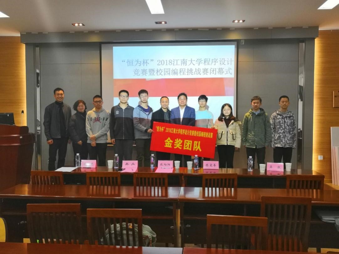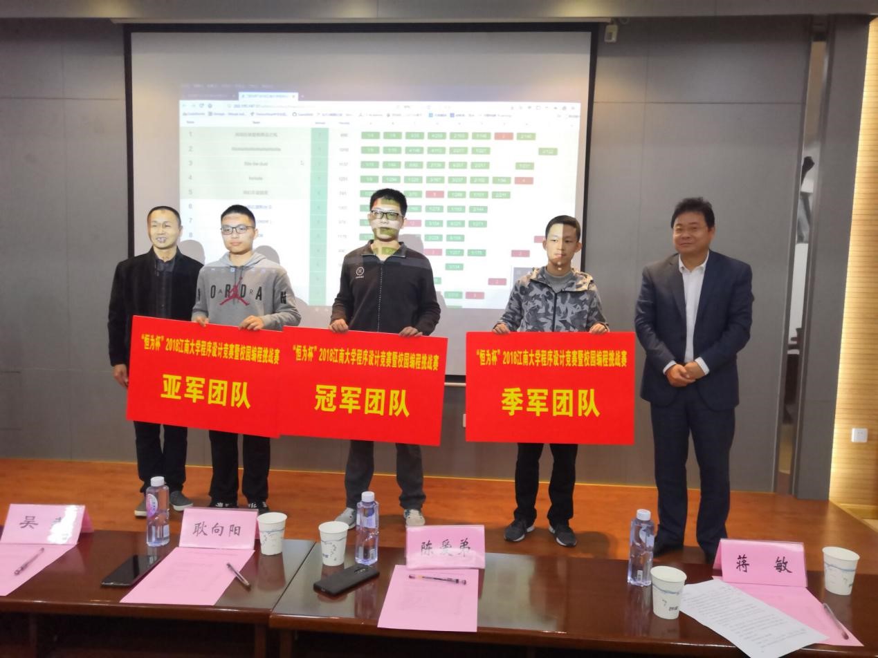 党委副书记、副院长耿向阳上台发言,他代表学院祝贺此次比赛顺利举行,同时由衷感谢恒为(上海)科技股份有限公司的大力赞助,让此次比赛顺利进行,并衷心祝贺获奖团队,希望所有参赛队伍能继续努力,取得更好的成绩。随后,本次竞赛教练组及裁判团队代表乔天池进行比赛试题讲解。紧接的是颁奖环节最为激动人心的时刻——滚榜:在比赛的最后一个小时,进行了封榜。所有参赛队伍无法看到最后一小时的队伍排名变化情况和其他队伍解题情况。在滚榜环节时看着一支支队伍在最后一小时的排名随着时间上升或下降,颁奖过程进入了高潮阶段。经过滚榜后,计算机1701许轲团队夺得冠军。之后,ACM俱乐部教练蒋敏老师上台发言,她首先祝贺了所有的获奖队伍,感谢学院领导的支持、恒为(上海)科技股份有限公司的大力赞助和在场所有的参赛选手的努力,随后带领大家回顾了整个比赛的精彩过程。最后,恒为(上海)科技股份有限公司的华东区经理陈爱第先生上台发言。他代表恒为公司对本次比赛的圆满成功表示祝贺,他回顾了恒为科技赞助本次比赛的全过程,期待校企合作碰撞出更多成果。