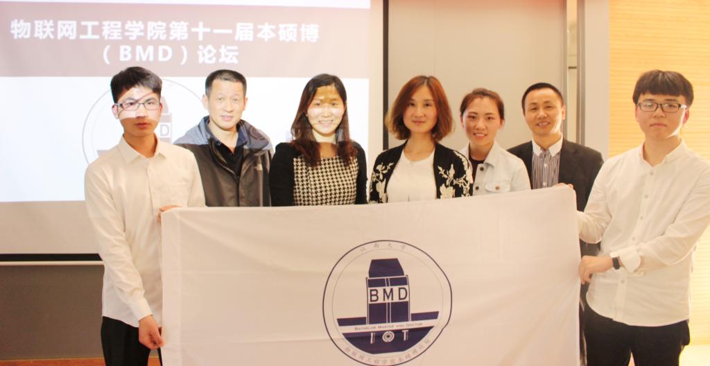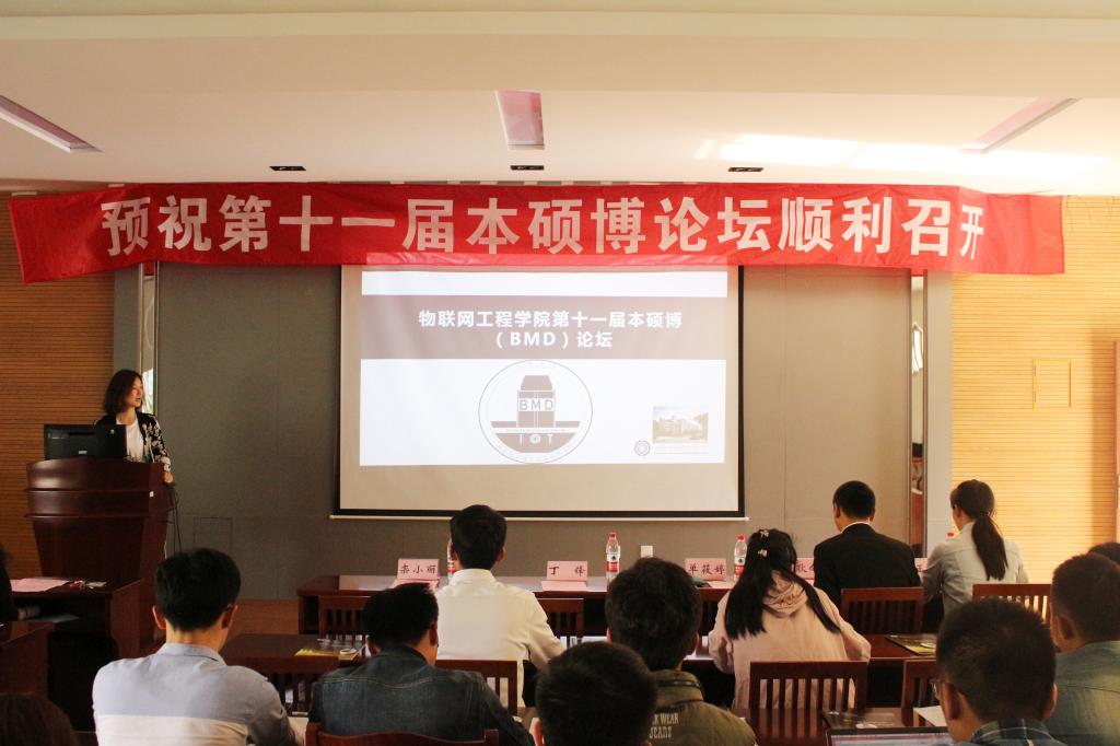 的学生在历届本硕博论坛中所取得的成绩,鼓励物联学子再接再厉。学院副院长栾小丽老师在致辞中举例说明了历届本硕博论坛在促进学生发展方面发挥的重要的作用,对本届论坛寄予深切的厚望。研究生代表岳慧慧同学讲述了作为一名学生的权利和义务,强调了学生的权利与义务的异同之处,希望物联学子能够在享受权利的同时积极认真地履行义务。随后,学生代表宣读了学术道德倡议,并向与会成员分享了本次论坛的LOGO的意义所在。