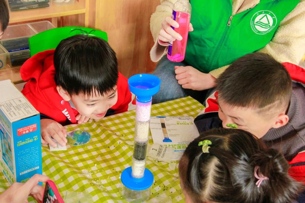 “脏水从这个漏斗口流下去,从上到下,依次经过花岗岩石子、瓷沙、活性炭、石英砂的过滤,最后杂质就被吸走了。”实验中,一位小朋友用稚嫩的语言向我们复述装置的实验原理。越来越多的小朋友向志愿者分享实验成果,“老师,水变干净了!”“老师,颜色被吸走了!”。通过实验,孩子们对水环境的相关知识了解更近一层。