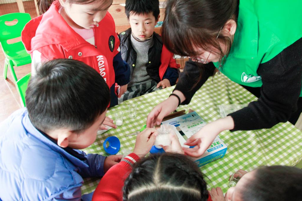 在宣讲的最后,小朋友们争相分享自己的节水小妙招:“洗菜的水可以用来浇花”“每次用完水龙头要拧紧”等,引发小朋友们对节约用水的思考。在实验环节,志愿者孙永富带领小朋友们开展了“饮用水酸碱度测试”和“污水净化”小实验。志愿者为小朋友们准备了净水系统科学套装,小朋友们五人一组,在小组志愿者的指导下积极参与、亲身体验。