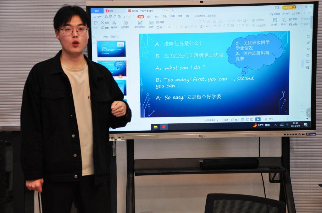 武扬围绕“如何做一个好学委”展开分享。他认为学习委员的工作事关班级同学的前途与发展,每一位学习委员要在努力成为学业先锋的同时,致力于“想方设法”在班级内营造良好学习氛围。随后,他将工作任务分为“基本任务”和“进阶任务”,就班级学风建设注意事项和措施,如学业情况统计、资料搜寻、重点帮扶、科研竞赛动员等方面进行具体阐述,扎实用心的工作态度赢得与会人员的热烈掌声。
