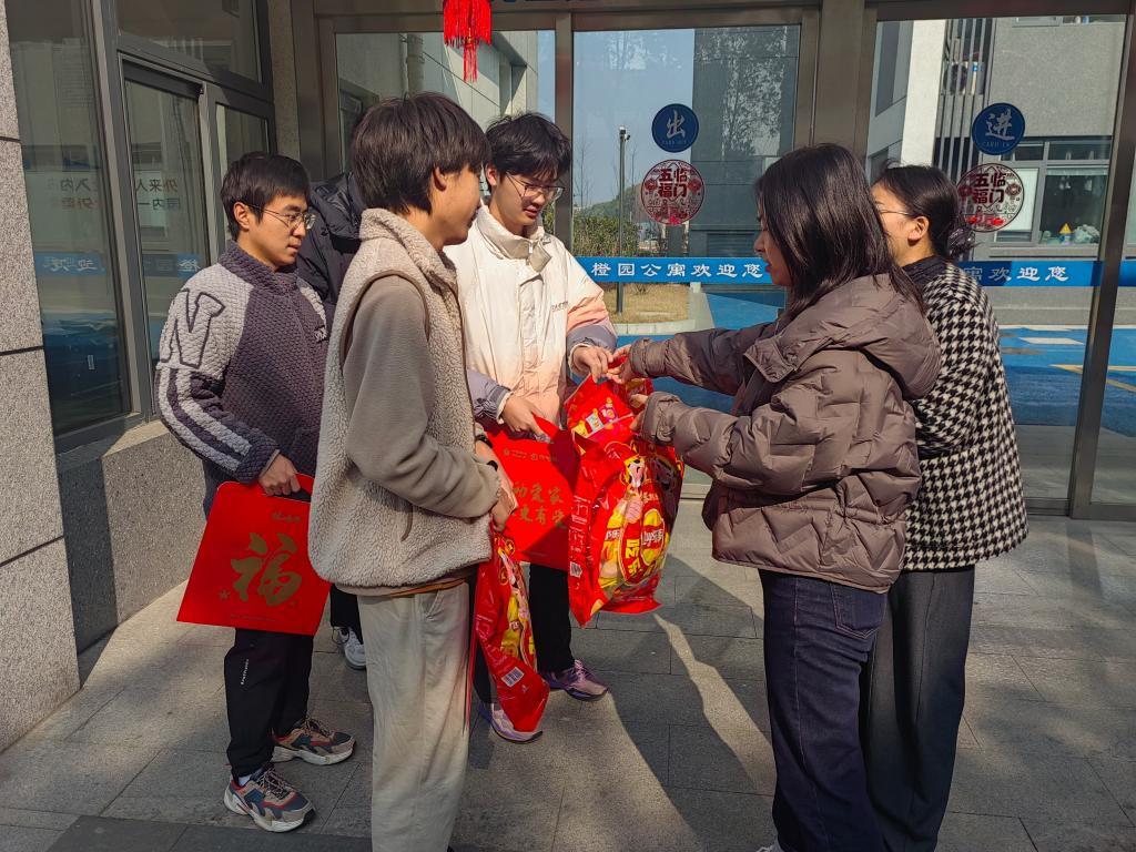 交流过程中,留校学生积极分享自己的学习生活点滴,对学院的暖心慰问表示感谢,纷纷表示要将学院的关心关爱转化为提升自我的强大动力。吴妍代表学院向同学们表达了节日的问候,送上了学院精心准备的新春大礼包。随后,老师和同学们一起动手张贴春联,现场欢声笑语不断,充满了喜庆热闹的氛围。