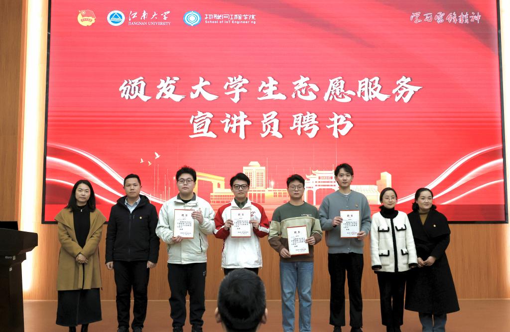 聘书颁发环节,校团委副书记单云婷、av片 党委副书记吴妍、无锡市滨湖区团委副书记肖江,校学生工作处学生管理科科长杨艳共同为四位优秀的物联追“锋”者颁发“大学生志愿服务宣讲员”聘书,激励四位宣讲员肩负起传播志愿服务精神的重任,以自身经历激励更多同学投身志愿服务。