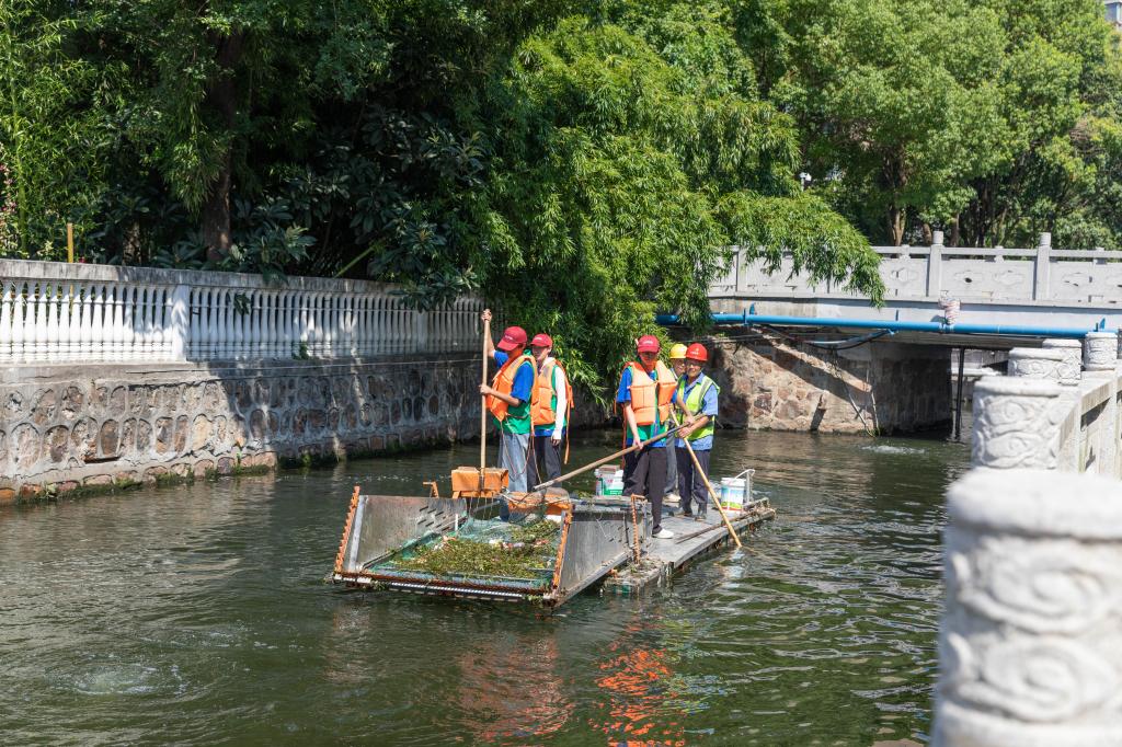 躬身力行:净滩护水,践行青春誓言。实践团将所学所感付诸行动,先后在新吴区前进河(居民区、菜场周边)和滨湖区太湖大堤开展两次净滩行动。烈日下,成员们身着统一装备,细致清理水面漂浮物及沿岸垃圾,累计清理岸边垃圾9.5公斤。在前进河中央水域,成员们身穿救生衣登船作业,在随船师傅指导下,使用长杆打捞网和特制镰刀,清理缠绕垃圾的恶性水草“喜旱莲子草”。两小时清理水面垃圾12公斤。“传统净滩治标,深水打捞治本,”队员樊铭举指着满载的污染物说,“这些生活垃圾若不及时清理,会持续污染整条河道!”