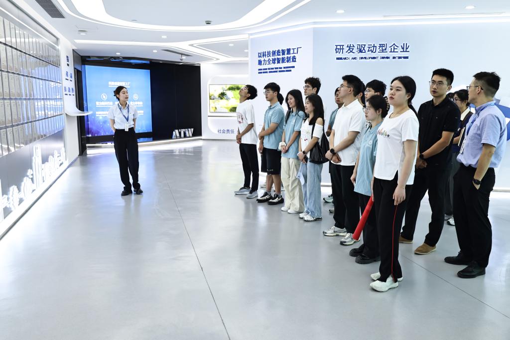 参观研学,感知智造新动脉。实践团师生深入各企业展厅、生产车间等一线场所,实地了解企业发展历程与前沿动态。在朗新科技产业园,动态数据墙清晰展示了其“能源数字化+能源互联网”双轮驱动战略的转型脉络。在卓品智能,师生们感受了企业自主创新、突破技术封锁的历程;在小天鹅电器,团队师生了解了企业的发展历程和产品品类,体会企业如何用“科技+品牌”策略精准触达多元需求。在先导智能,讲解员介绍了公司从电容器设备制造起步,逐步拓展至光伏、锂电、氢能、智能物流四大核心业务领域的战略布局与发展历程,制造车间内自动化设备的精准运作令人印象深刻;奥特维运行车间内高效的激光切割与双模具焊接场景,以及威孚集团“四次创业”的发展历程与智慧工厂管控平台的实时数据流,生动展现了从“传统制造”迈向“数字制造”的升级图景,让同学们身临其境地触摸到产业前沿的发展脉动。