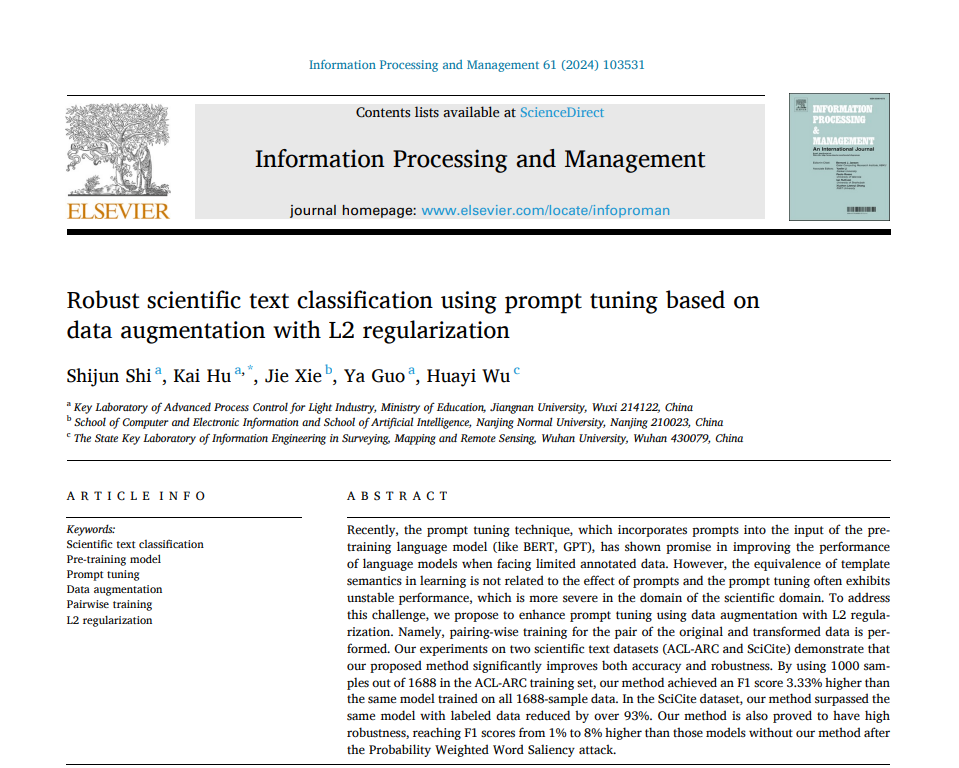 2020级本科生时世骏以第一作者身份在《Information Processing & Management(IP&M)》(中科院一区,IF=8.6)发表题为“Robust scientific text classification using prompt tuning based on data augmentation with L2 regularization”的学术论文,该期刊是Elsevier出版社旗下信息科学领域的权威期刊之一。av片