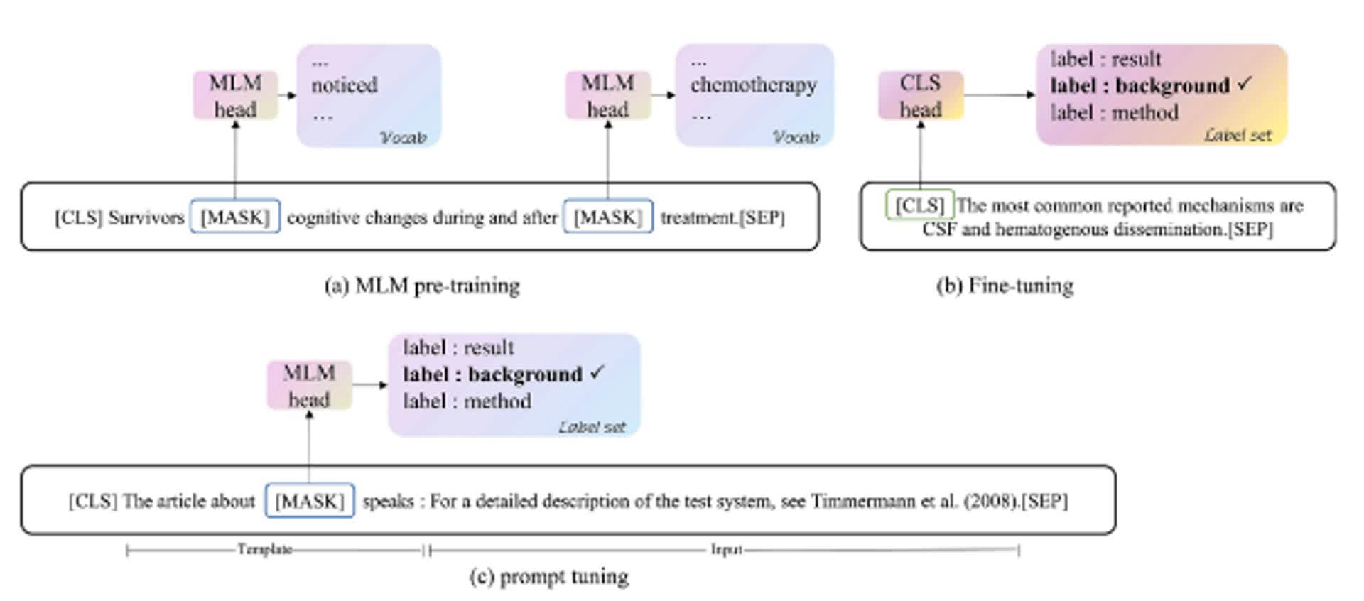 图2:掩码语言模型(MLM)预训练(a)、BERT模型的微调(b)和提示学习方法(c)