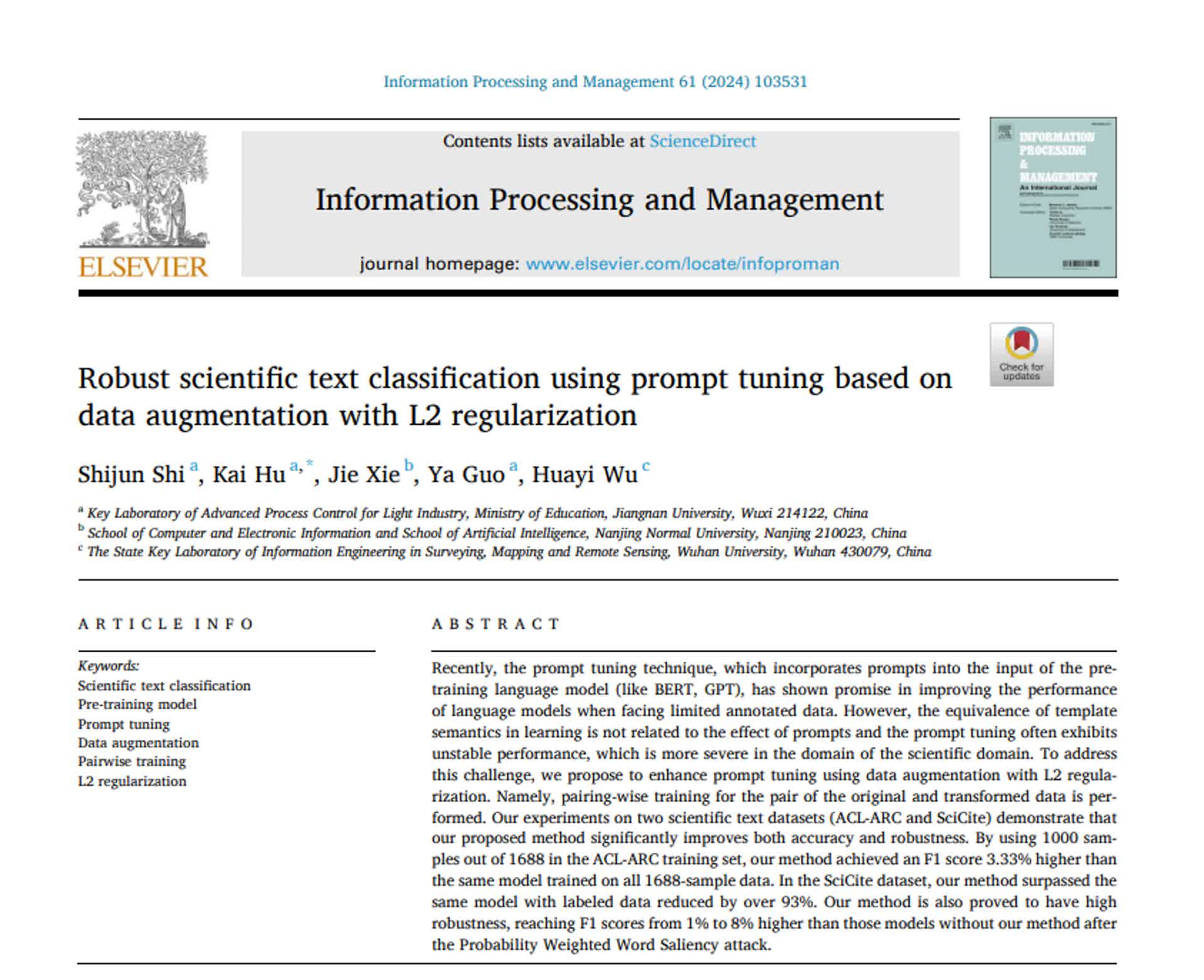 2020级本科生时世骏以第一作者身份在《信息处理与管理》(中科院一区,IF=8.6)发表题为“使用基于数据增强和L2正则化的提示学习进行鲁棒的科学文本分类”的学术论文,,该期刊是Elsevier出版社旗下信息科学领域的权威期刊之一。av片