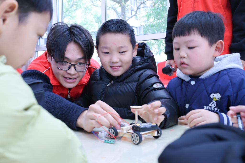 为了让小朋友们更直观地体验芯片的科技之美,课堂上设置了“声控智能小车”的动手实践环节。在志愿者们的指导下,孩子们探索芯片的奥秘。从组装车架、对接电线、粘贴芯片模组、固定齿轮、安装电池,小朋友们五人一组动手“施工”。