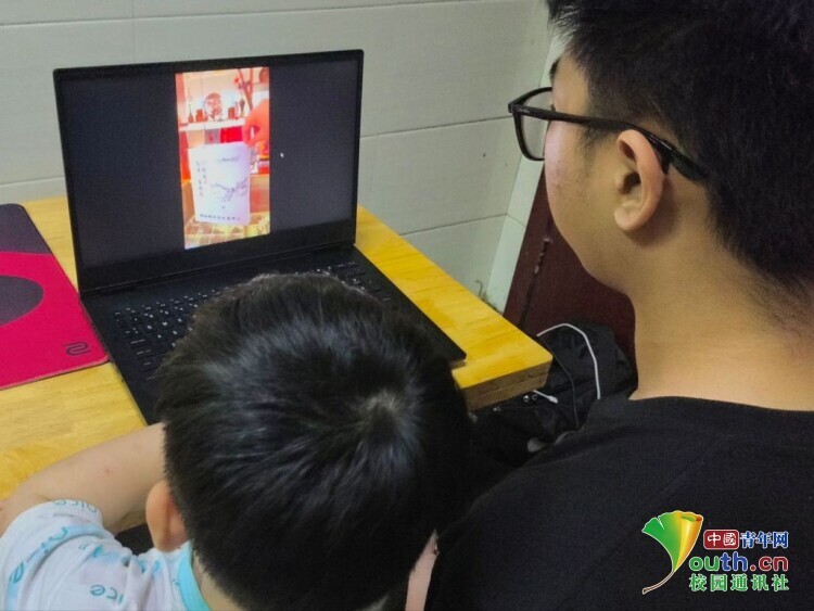 图为实践团成员与家乡社区孩童观看视频短片。季泽 供图